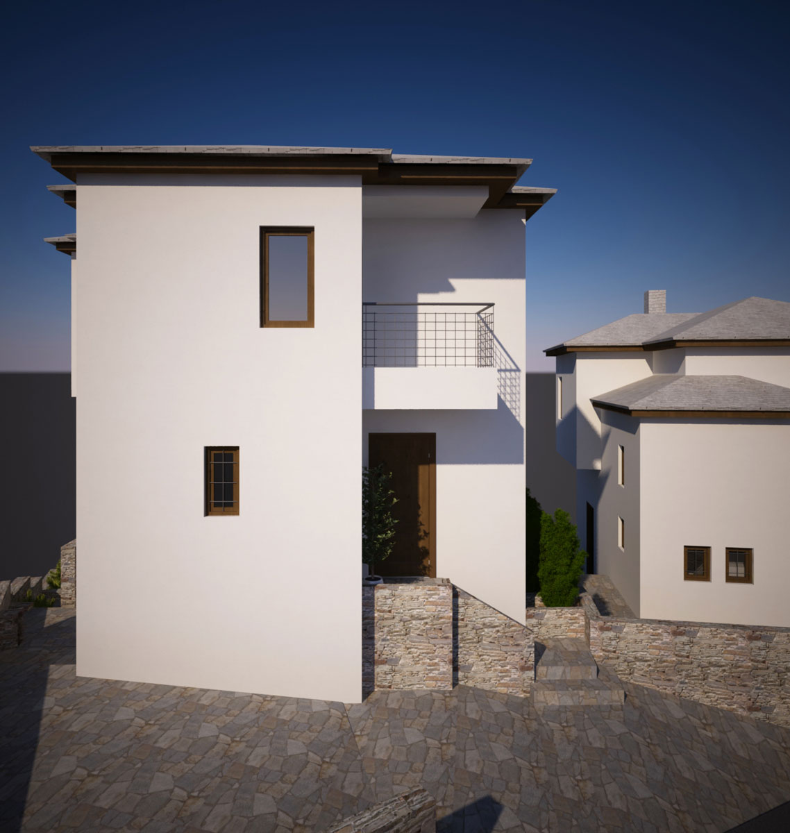 The two-story house with a stone roof and basement is located on the highest part of the plot. It faces south, with a unique view of the Pagasetic Gulf, as well as the traditional settlement of Agios Georgios. The entrance to the house is directly accessible from the private parking area. The entrance to the residence is directly accessible from the private parking area. On the first level of the ground floor, there is an entrance hall, a spacious kitchen, and a restroom, while the spacious living room with a fireplace is located below. The outdoor areas and balconies on the ground floor are arranged around the residence, providing a continuous view of the sea. The central staircase connects the first floor, with its traditional wooden beams, which consists of three bedrooms and the main bathroom, and the basement with the common areas and the auxiliary toilet. The surrounding area, on the eastern edge of the settlement, is formed by gardens and paved terraces that follow the morphology of the landscape.