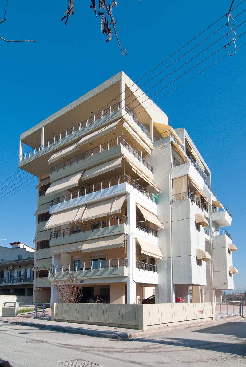 Στη Χαραυγή, μία περιοχή της πόλης της Λάρισας με αυξανόμενη οικοδομική δραστηριότητα την τελευταία πενταετία, μελετήθηκε και κατασκευάστηκε σε γωνιακό οικόπεδο εμβαδού 630,00τ.μ. μια πενταόροφη οικοδομή κατοικιών με σχεδιαστικό γνώμονα τη μέγιστη διαμπερότητα στα διαμερίσματά της. Δύο βασικοί κτιριακοί όγκοι συνθέτουν το κτίριο και επικοινωνούν μεταξύ τους μέσω του κοινόχρηστου κλιμακοστασίου, που αποκτά, πλέον, σημαντικό ρόλο στη σύνθεση. Μορφολογικά, διακρίνεται εμφανώς η πρόθεση των μελετητών για τη σύνθεση ενός ενιαίου αρχιτεκτονικού συνόλου.